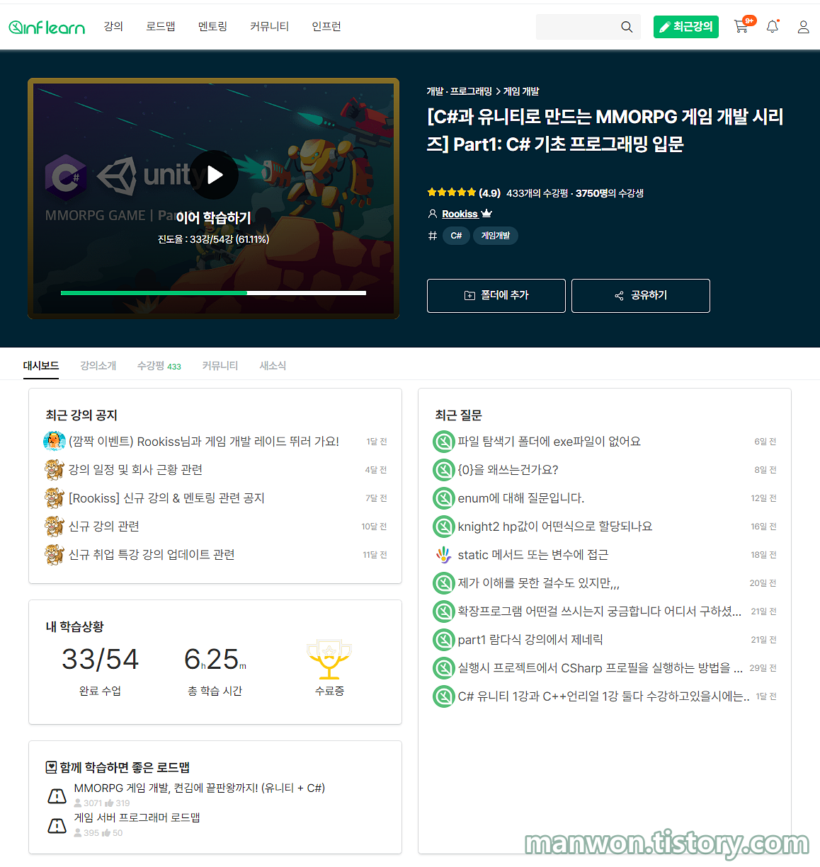 위 사진은 내가 현재 수강하고 있는 인프런 ROOKISS 강사의 C#과 유니티로 만드는 MMORPG 게임 개발 시리즈 PART1 대시보드를 캡처한 것이다.