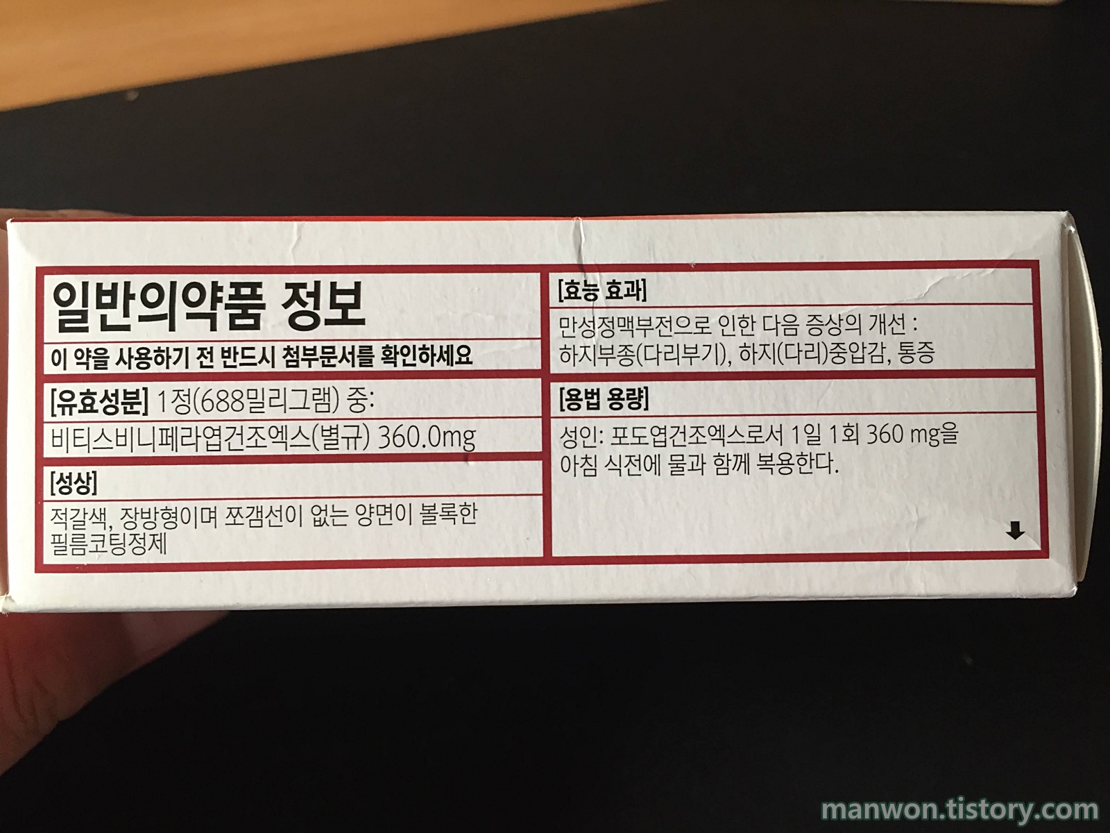 비티스비니페라엽건조엑스 360.0mg이라고 표시되어 있는데 그게 포도잎 추출물인 듯싶다.
