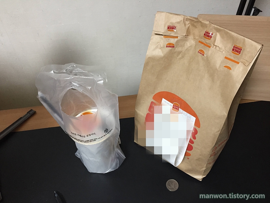 내가 주문한 건 통새우 와퍼 세트였는데 위 사진에 보이는 종이봉투를 들어보니까 살짝 평소보다 묵직했다. 그런데 처음 음료수를 봤을 때 나는 스프라이트를 시켰는데 콜라가 채워져 있었다. 이때 눈치를 챘어야 했는데... 여하튼, 감자 튀김은 내가 안 먹고 내일 아침에 어머님 드릴 꺼라 나는 허겁지겁 급하게 햄버거 포장을 까고 한 입 베어 물었는데....