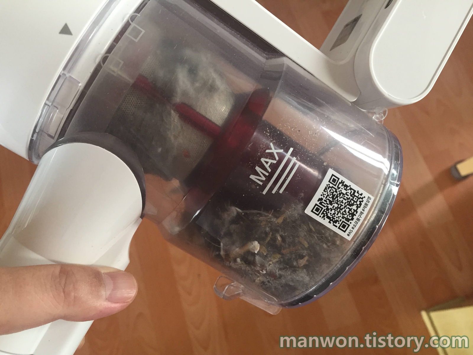 위 사진처럼 먼지통 상단의 기둥에는 작은 먼지와 머리카락이 모이게 되는데 문제는 이게 서로 엉키듯이 통에 묶인 상태로 존재하게 된다는 거다. 다시 말해서 먼지를 제거할 때 저 엉킨 부분을 떼어내기 위해서 위생장갑 낀 손으로 긁어내는 작업을 해야 한다는 거다. 그냥 구형 유선 청소기에서는 먼지통만 싹 돌려 빼서 안에 내용물 전체를 봉투에 쏙 하고 버리면 돼서 매우 편리했는데 말이다.