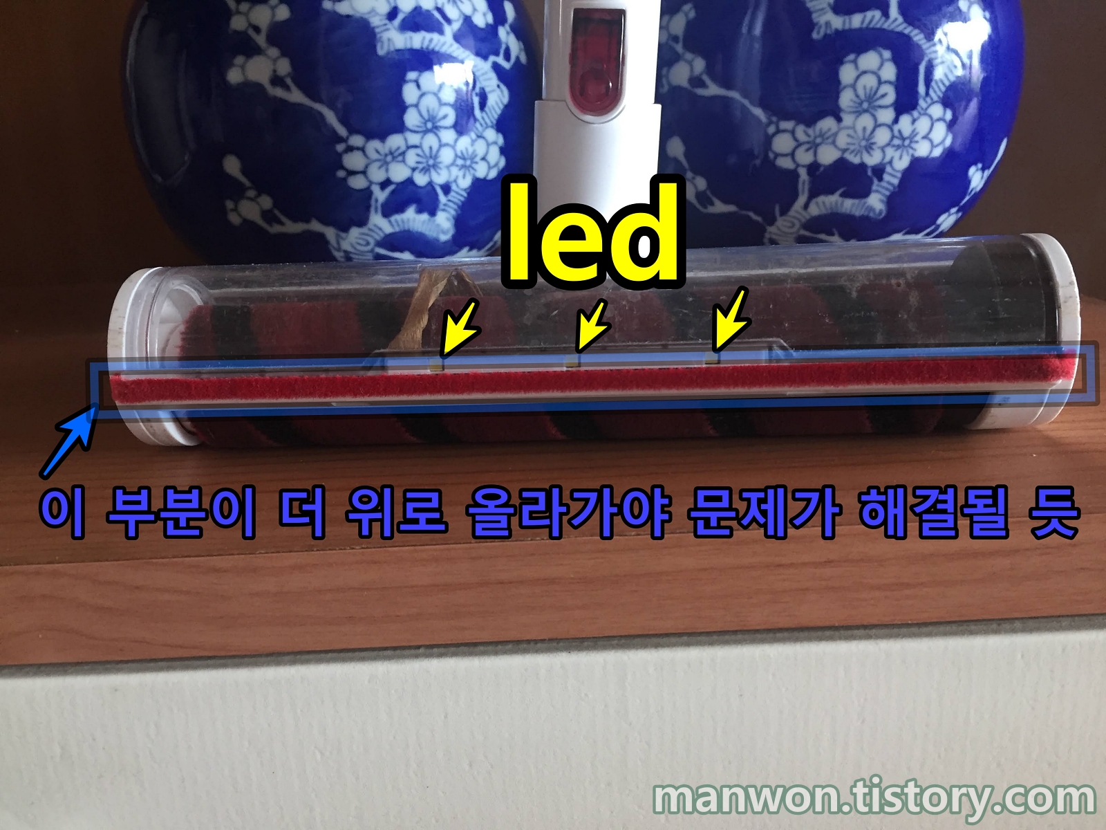 위에서 언급한 문제의 원인은 위 사진을 보면 알 수 있다. 바로 파란색 테두리로 표시한 부분이 너무 아래까지 내려와 있기 때문이다. 먼지를 잘 보이게 해주는 LED가 정면을 향해야 하기 때문에 어쩔 수 없이 그렇게 설계가 된 것 같은데, LED를 차라리 떼어내더라도 파란색 테두리 부분을 훨씬 더 위로 올려야 할 것이다. 그래야 구석에 위치한 먼지를 빨아들이는 데 지장이 없을 것이다.