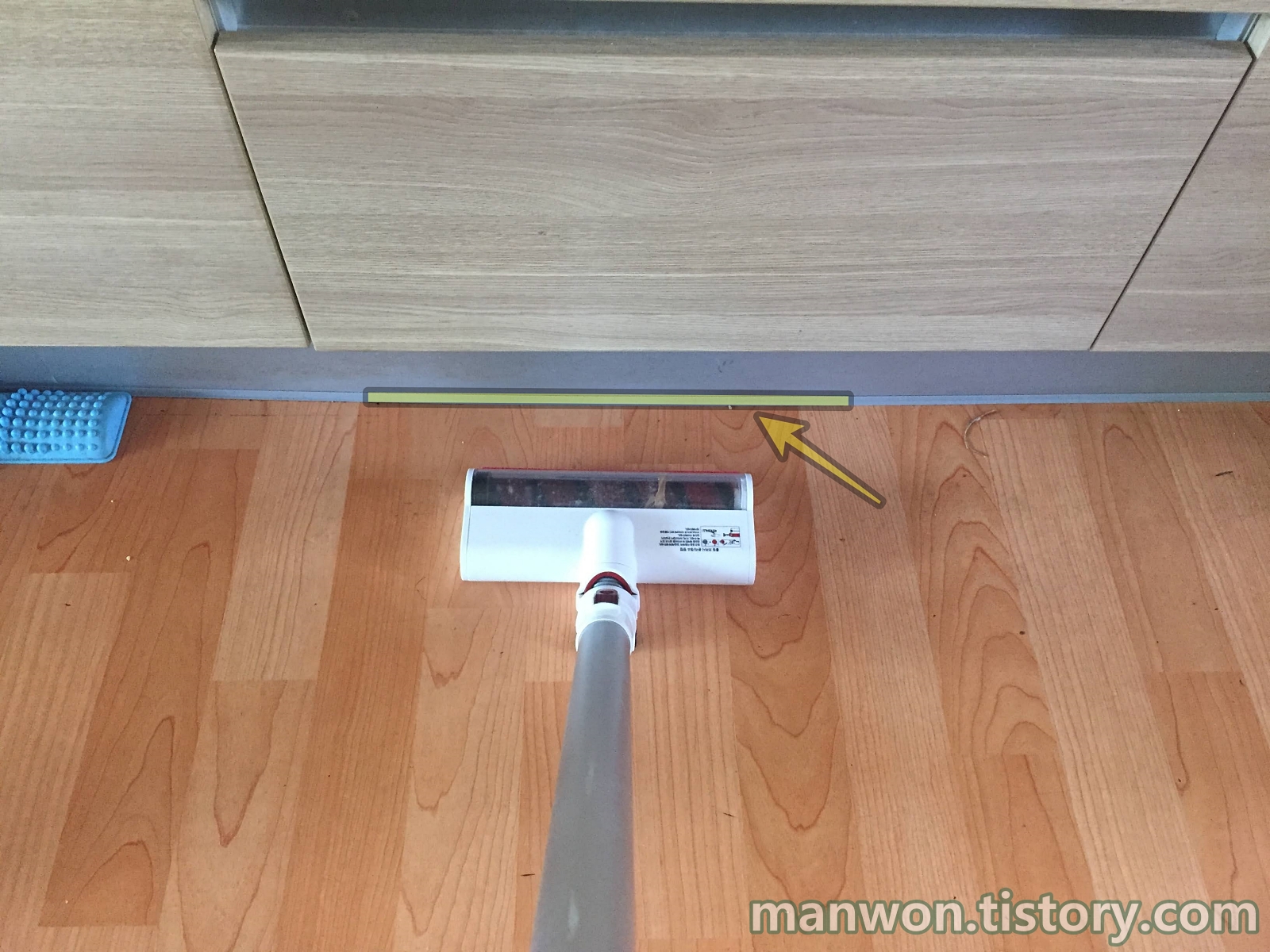 위 사진처럼 청소기 헤드가 향하는 걸레받이의 L자 부분 안쪽 모서리에 해당하는 곳의 먼지는 잘 빨아드리지 못할 때가 많았다. 위 사진에서 노란색 실선으로 표시한 곳 말이다. 내가 생각했을 때 이 문제가 가장 시급하게 개선되어야 할 부분이다. 청소할 때 너무 불편하다. 저런 곳에 위치한 먼지는 나중에 다른 흡입기로 한 번 더 청소해야 한다.
