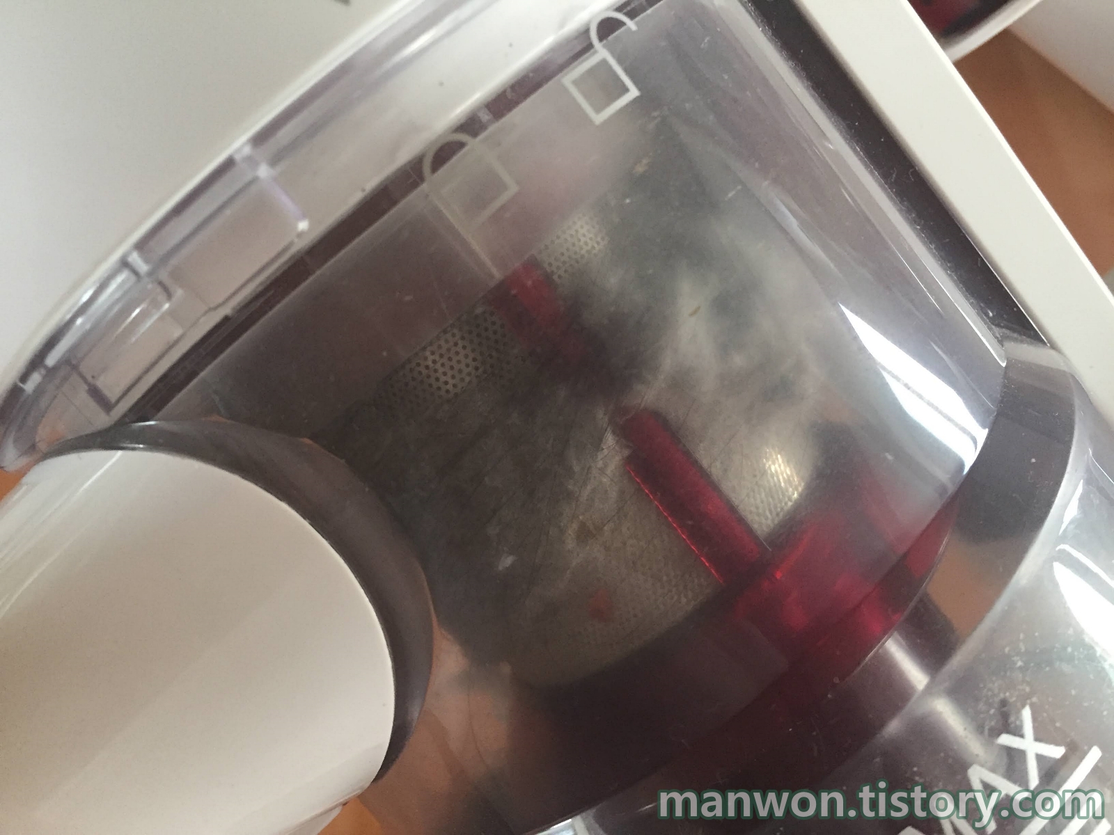 지금 사용하고 있는 한경희 무선 청소기의 먼지통이다. 여러 종류의 필터가 사용되는 방식이라 호흡기 건강과 위생에 좋다는 장점이 있다는 건 나도 안다. 하지만 이게 실제로 먼지통을 비우는 게 꽤 귀찮다. 위 사진을 보면 먼지통의 아래 부분에는 굵은 먼지 등이 모이고 MAX라고 적힌 글자 윗부분에는 훨씬 작은 먼지가 모이게 된다.
