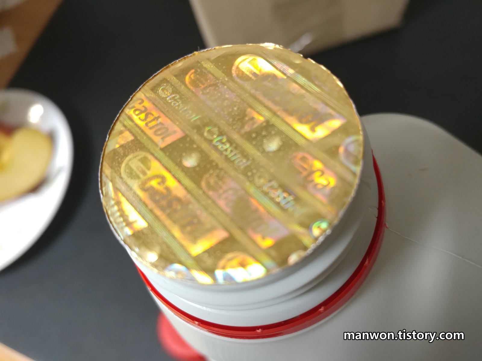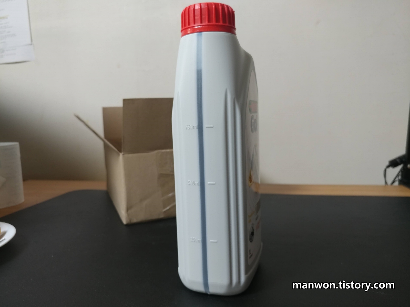 캐스트롤 GO 2T 엔진오일 측면에서 본 모습. 얼마큼 남았는지 확인할 수 있도록 반투명 노출 부위, 용량을 ml로 표시한 부분이 보인다.