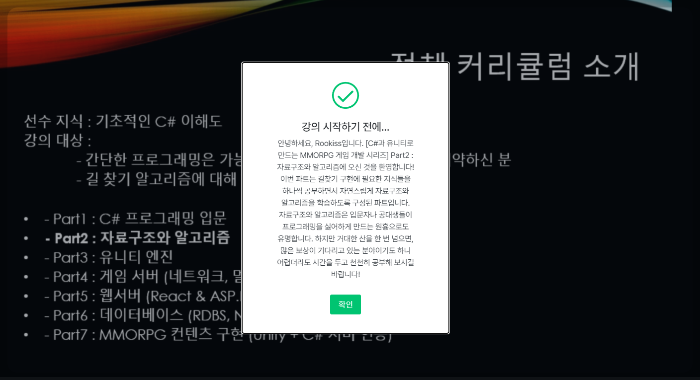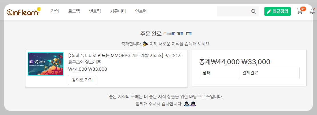 인프런에서 추석맞이 25퍼센트 전과목 할인 행사를 하고 있어서 Rookiss 강사의 C#과 유니티로 만드는 MMORPG 게임 개발 시리즈 PART2 - 자료구조와 알고리즘 강의를 3만 3천원에 결제했다. 원래는 4만 4천원 짜리 강의다.