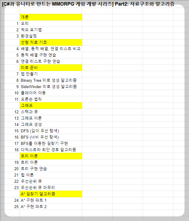 이번 PART 2의 강의 수는 총 25개이고 총 강의 시간은 6시간 45분이다. 위의 사진은 강의 과정을 내가 구글 쉬트에 옮겨 적은 것이다.