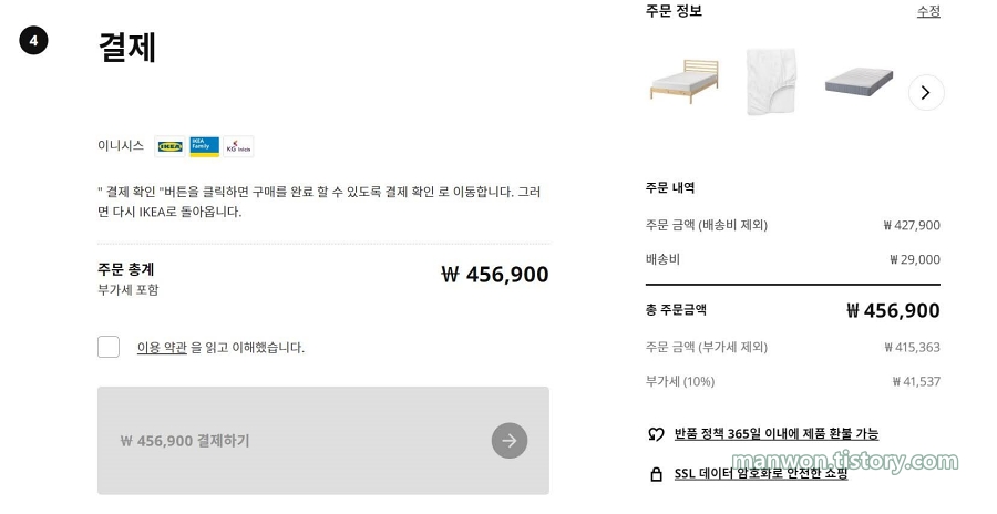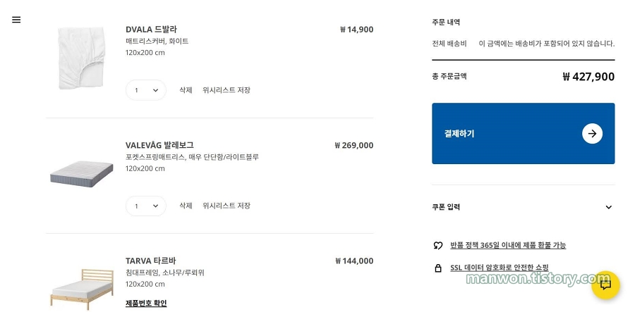 침대 프레임은 가장 저렴한 편에 속하는 TARVA 타르바로 구매했습니다. 매트리스 커버도 하나 추가하고 해서 총 주문금액은 427,900원입니다.