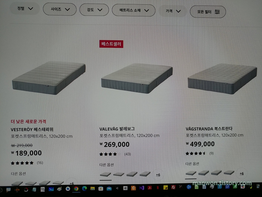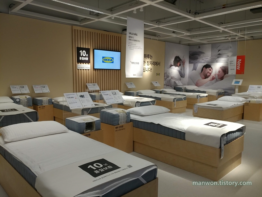 결제는 집에서 온라인으로 했습니다. 위 사진의 가운데 있는 발레보그 포켓스프링 매트리스를 26만 9천 원에 구매했습니다. 사실 오른쪽에 위치한 복스트란다로 구매할까 고민도 좀 했었는데요, 이케아 고양 매장에서 발레보그와 복스트란다 둘 다 누워봤는데 제 등판이 좀 둔감한 편인지 별 차이를 모르겠더군요.