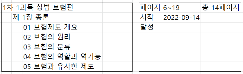 위 표를 보면 1차 1과목 상법 보혐편의 제 1장 총론을 목표로 삼았음을 알 수 있다. 총 페이지는 14페이지이고 공부 시작일도 기록했다. 하지만 달성일은 빈 칸으로 남겨놓았다. '언제까지 하루에 몇 페이지를 진행해서 꼭 달성하겠다'가 좋은 방법이겠지만 내 현실에는 맞지 않는다. 그래서 달성일은 비워 놓았다. 단 달성한 후에 그 날짜를 거기에 기록할 것이다.