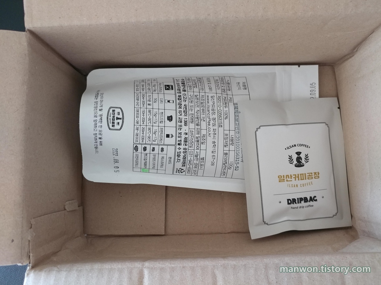 택배 상자 안에 이번에 주문한 일산커피공장 블랜드 원두커피 '시그니처'가 들어있습니다. 한편에 서비스로 드립백도 하나 넣어주셨네요.