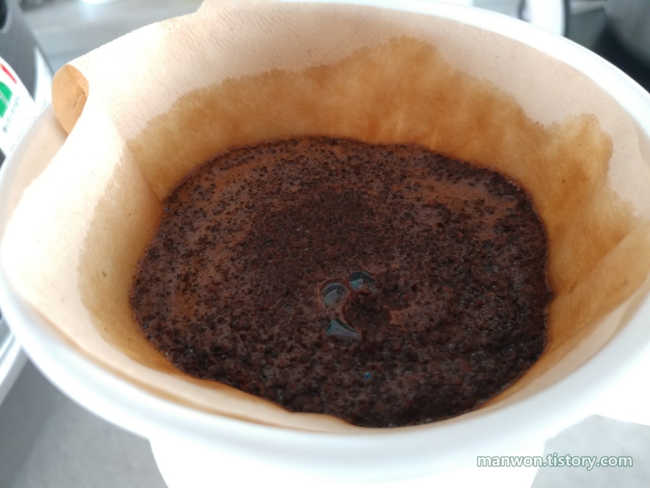 핸드드립으로 내리는 중입니다. 사진에는 나오지 않았지만 빵처럼 잘 부풀어 올랐습니다.