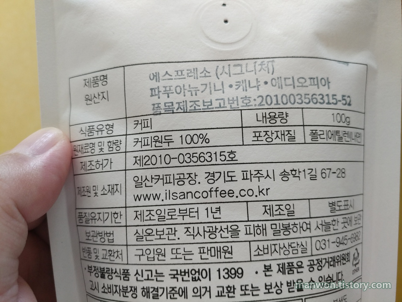 자! 다시 본품으로 돌아와서 이번에 메인으로 주문한 일산커피공장 블랜드 원두커피 시그니처 100그램 전면입니다.