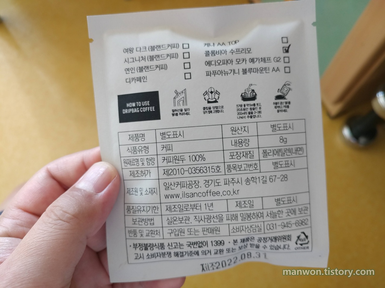 일산커피공장 드립백 후면. 서비스로 제공된 드립백은 블랜드 커피는 아니고 콜롬비아 수프리모 원두입니다. 개인적으로 콜롬비아 수프리모는 별로 좋아하지 않습니다. 너무 평탄한 느낌이라고나 할까요. 그래도 서비스로 넣어주셔서 감사한 마음이 들었습니다.