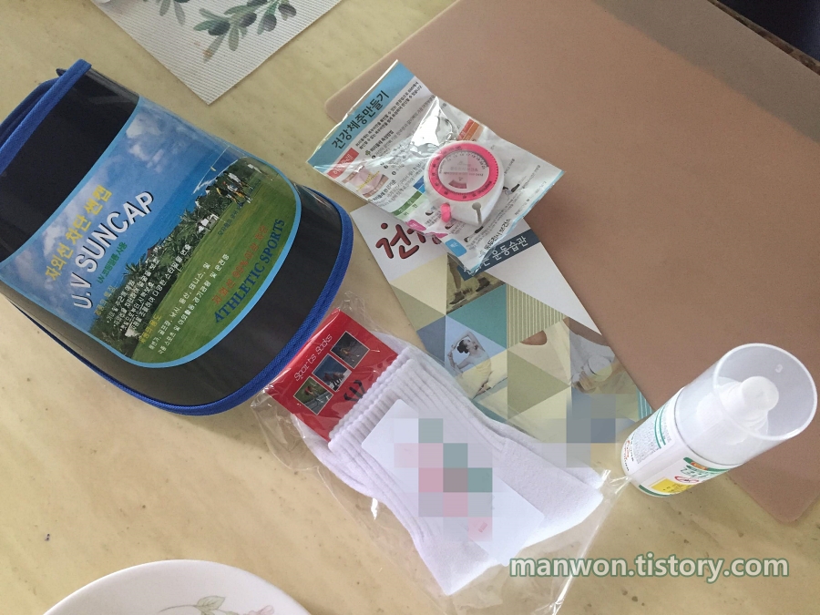 처음에는 웬 선캡? 이렇게 생각했는데 잠시 살펴보니 오늘 보건소에서 나눠준 물품은 야외에서 운동할 때 필요한 것들이란 걸 알 수 있었다.