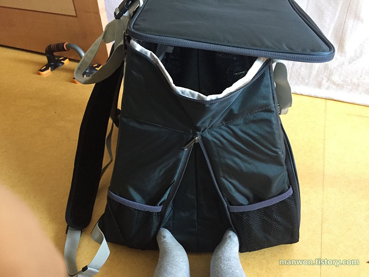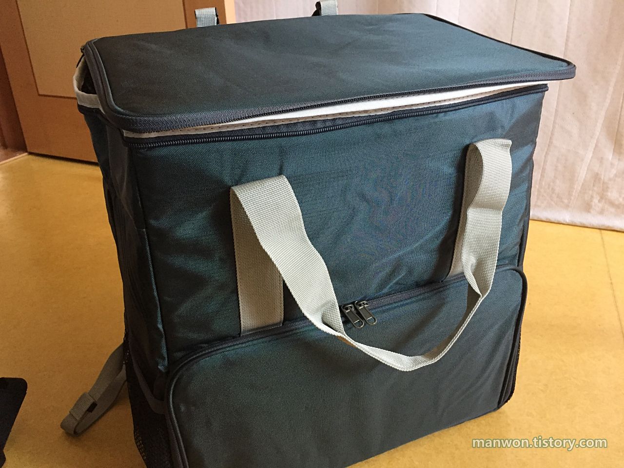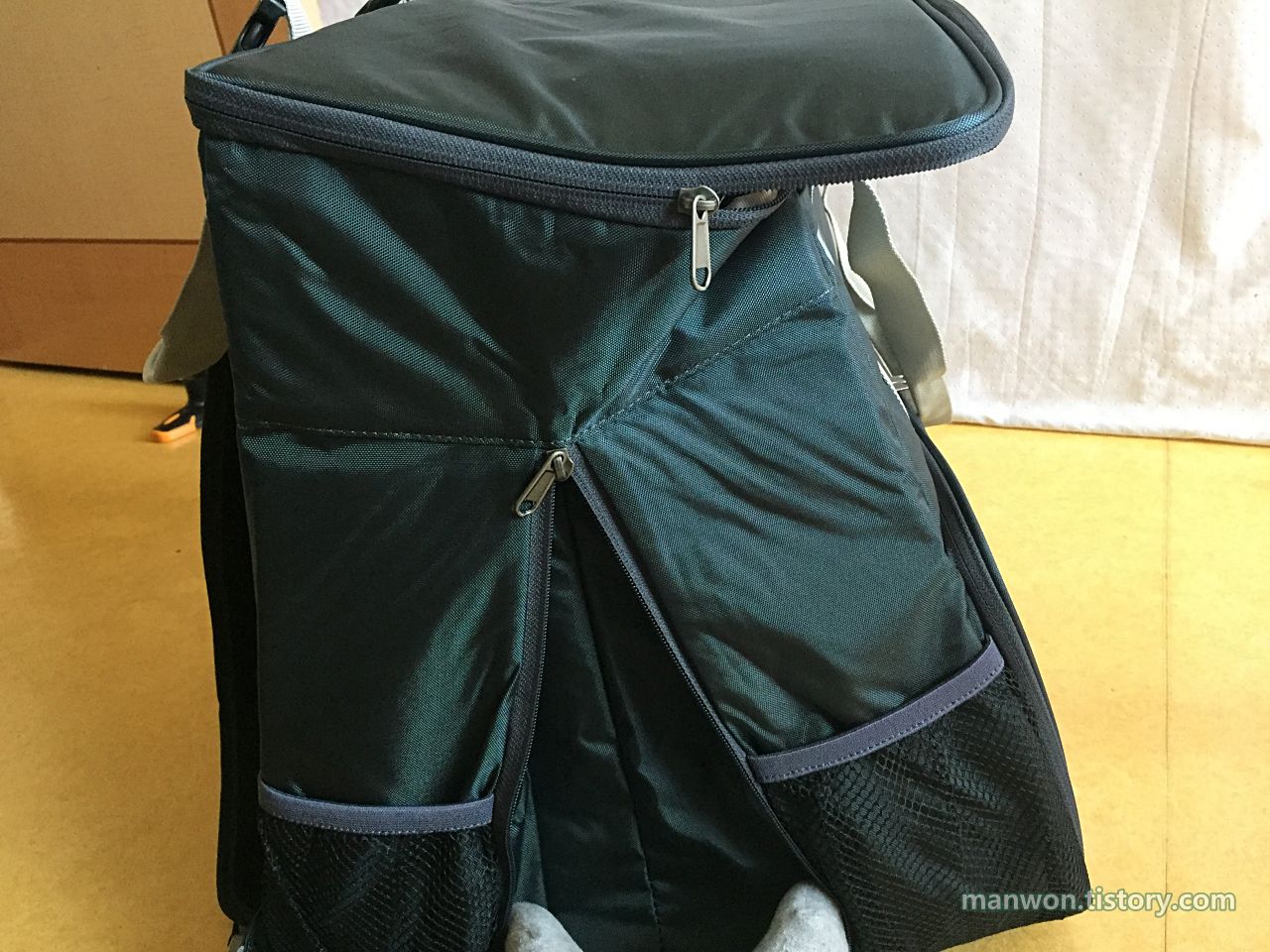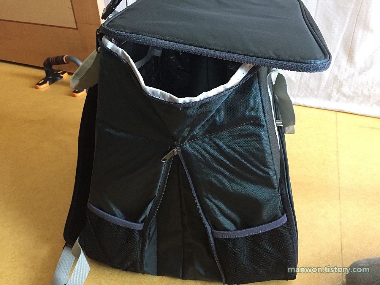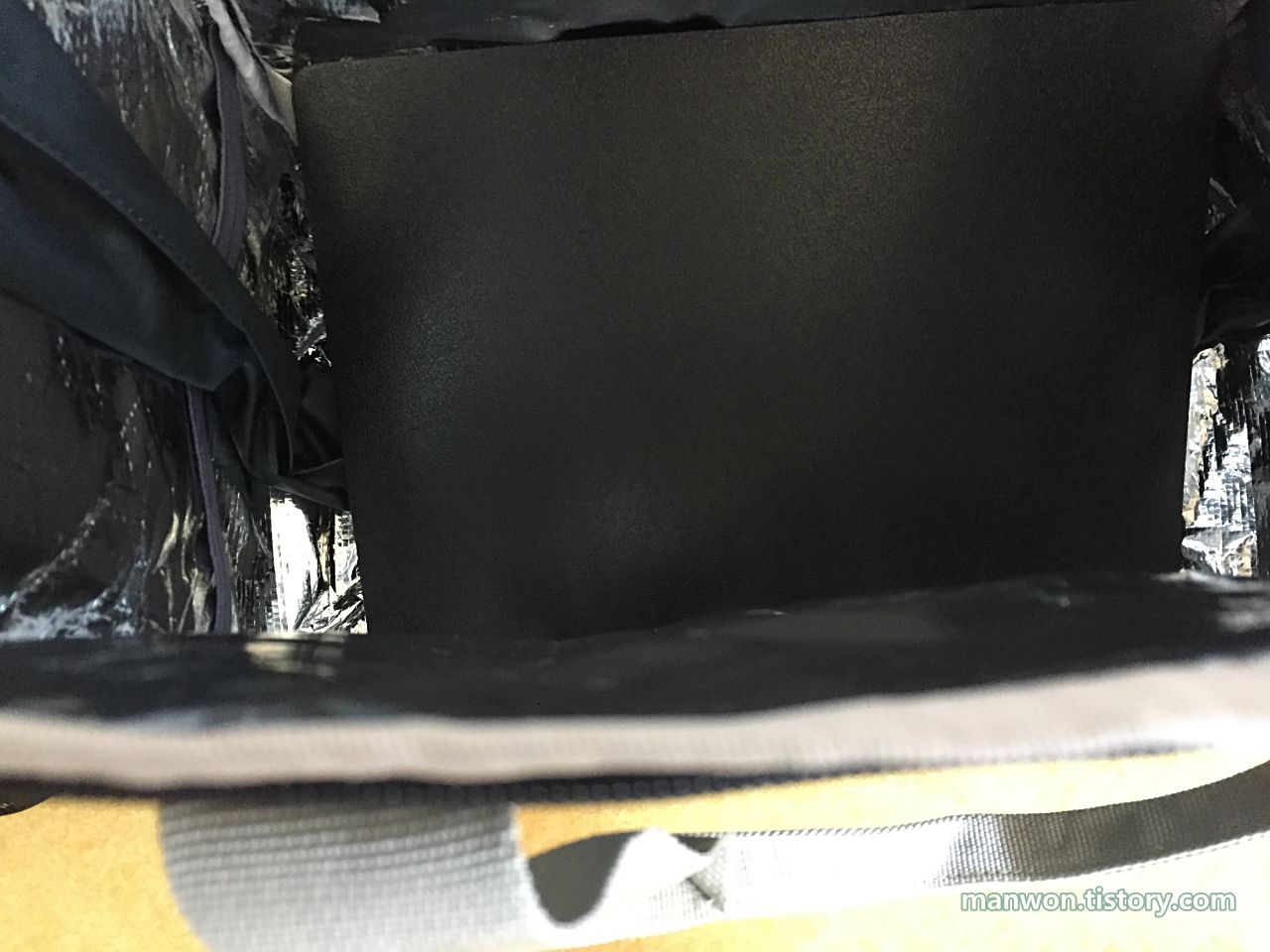 결국 위 문제를 해결하기 위해서는 가방 윗부분의 지퍼는 위 사진처럼 미리 잠근 상태로 가방 전면부를 개봉해서 피자 박스 넣는 것을 시도해야 한다.