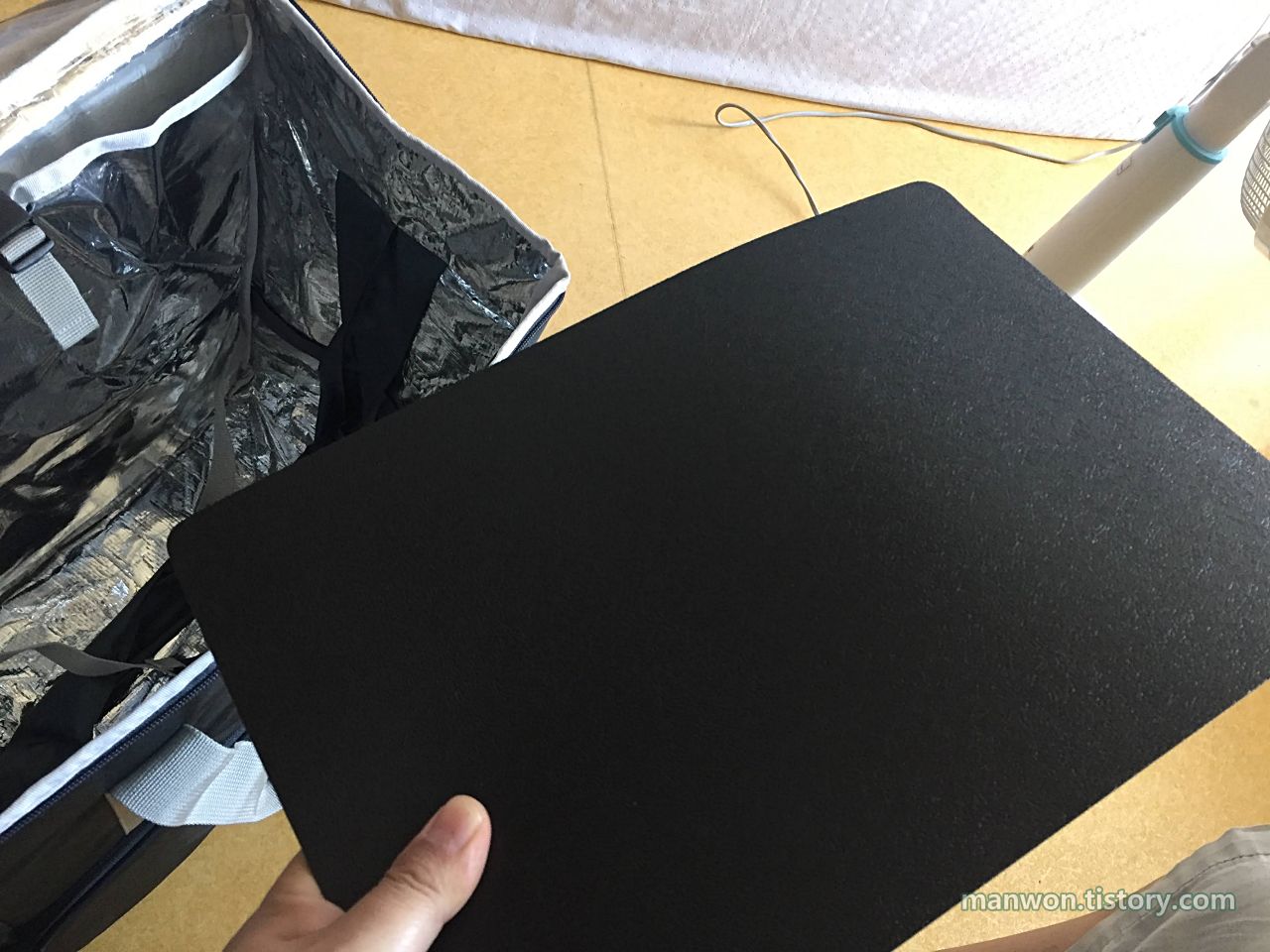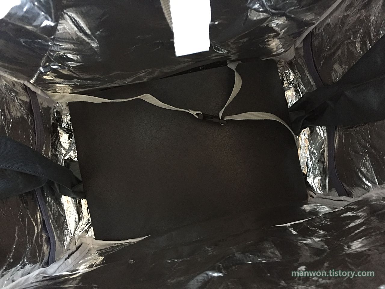 이게 그 밑면. 이걸 깔지 않으면 무거운 배달물을 싫었을 때 신형 가방 밑면이 버티지 못할 것처럼 재질이 약하게 느껴진다.