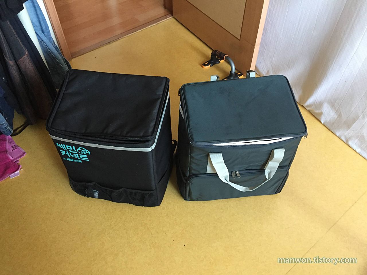 배민커넥트 가방 구형과 신형을 나란히 놓고 촬영했다. 왼쪽이 구형, 오른쪽이 신형이다.