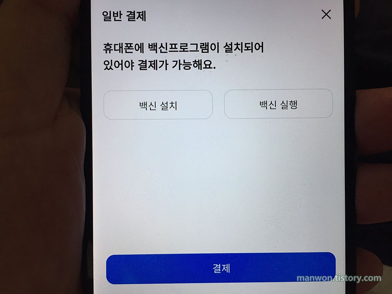 스마트폰으로 결제하려 했는데 위 사진처럼 백신 설치하라는 소리가 나와서 소리를 지르며 퇴장.