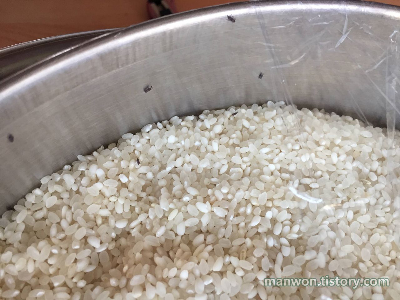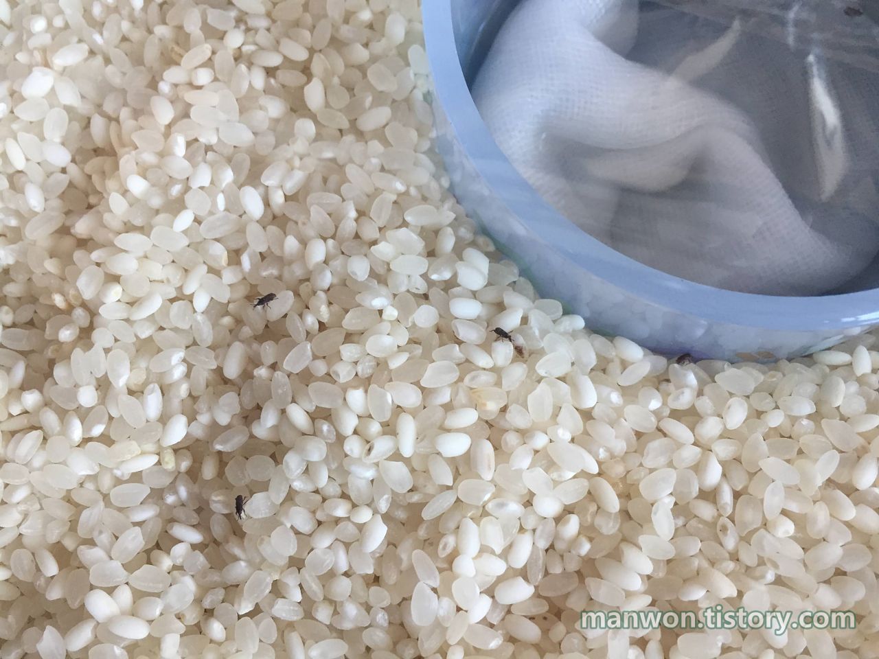 위 사진처럼 쌀가마니에 있던 쌀을 플라스틱 진공 쌀통과 스테인리스 통에 나눠 담은 후 각각 40도 안동소주를 적당량 거즈에 적신 후 넣어줬다.
