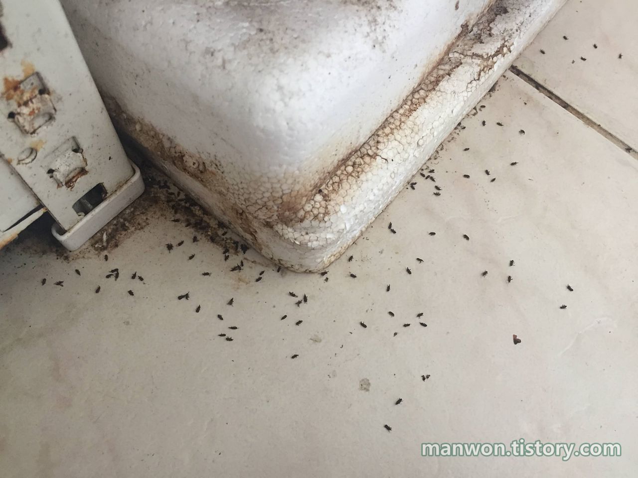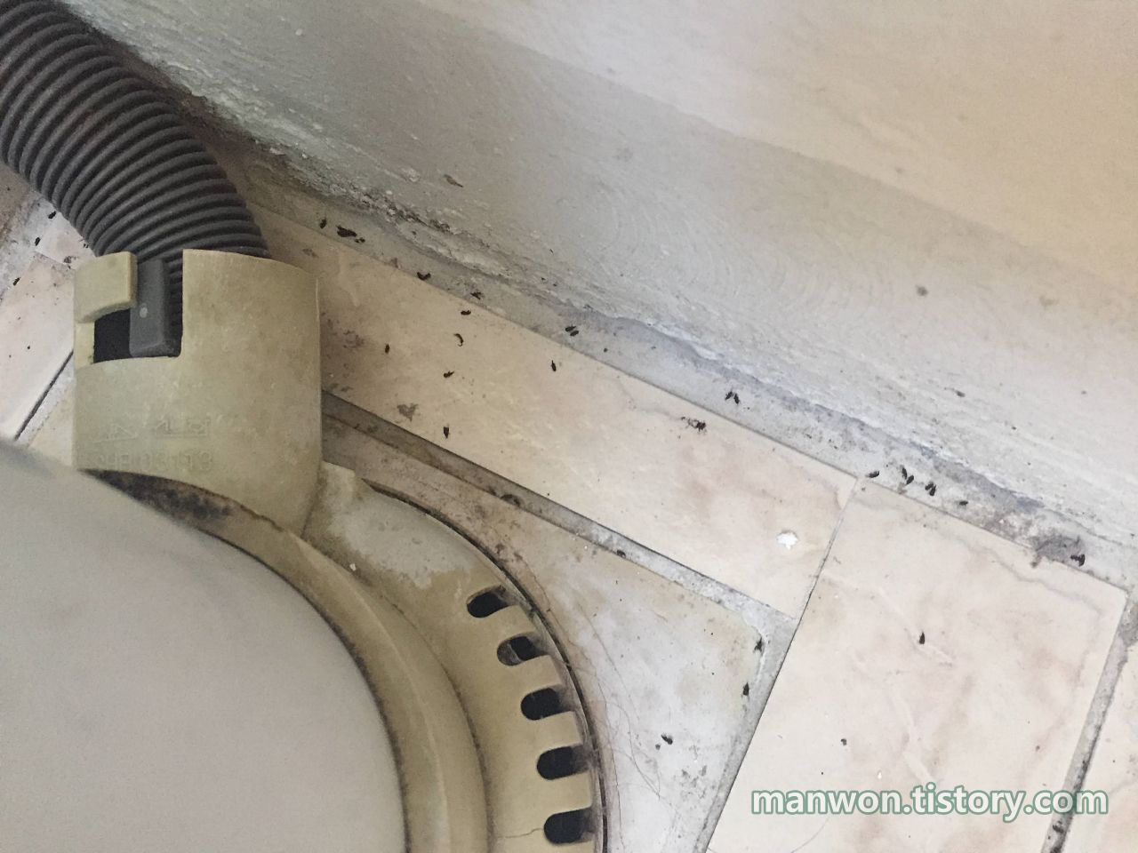 세탁기 배수구 주변에도 홈키파를 뿌렸는데 역시 많은 수의 쌀벌레가 죽은 채로 발견됐다.