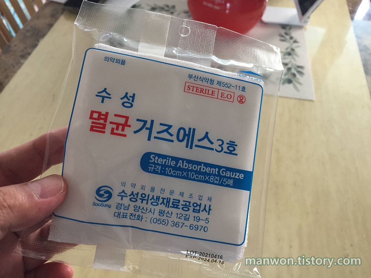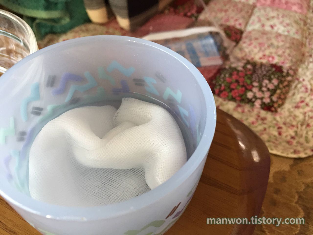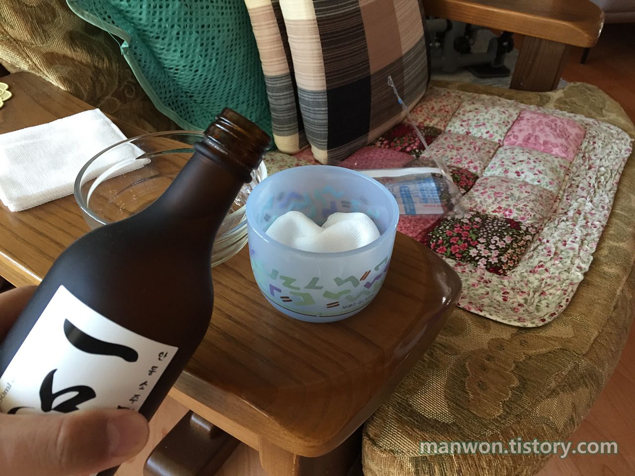 마찬가지로 작은 그릇에 거즈를 담고 40도 짜리 안동소주를 적당량 부어줬다.