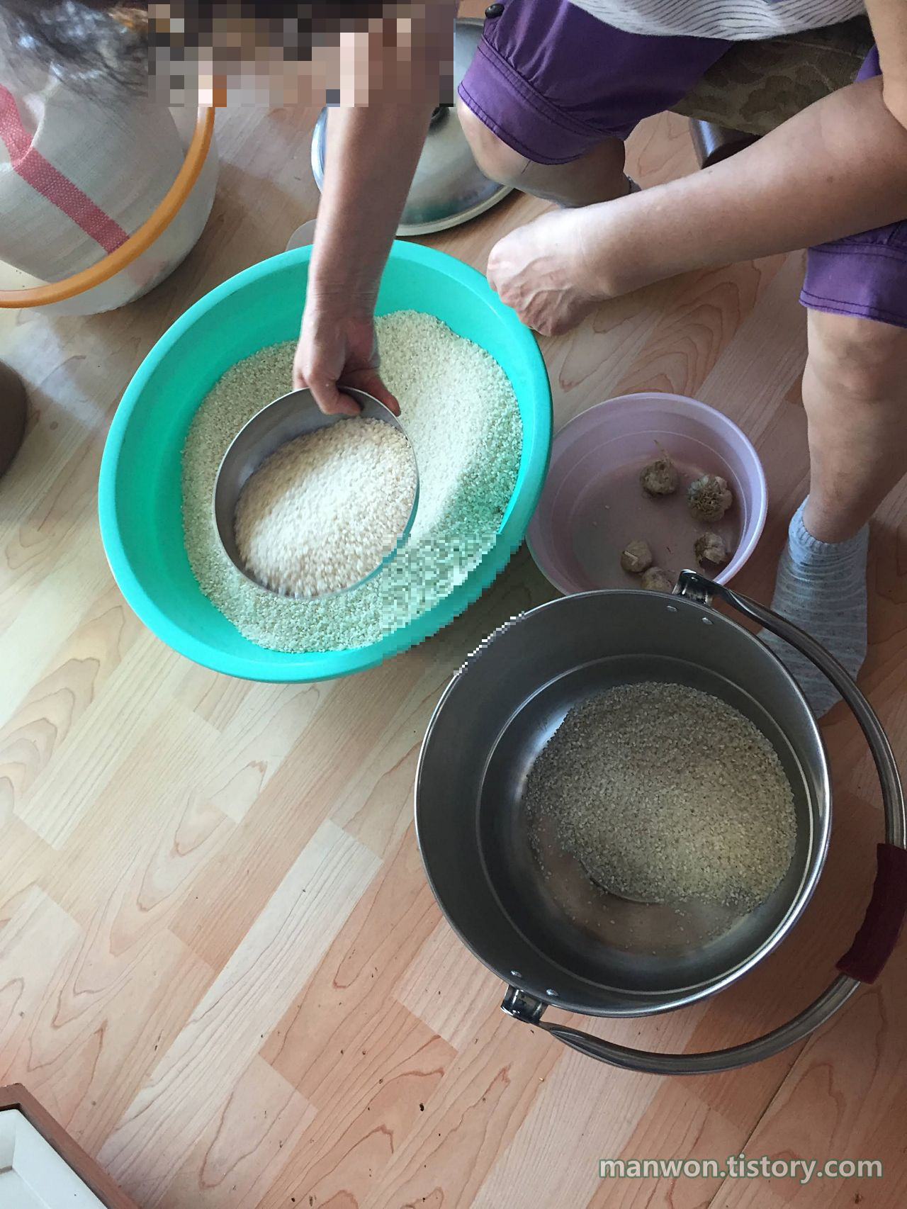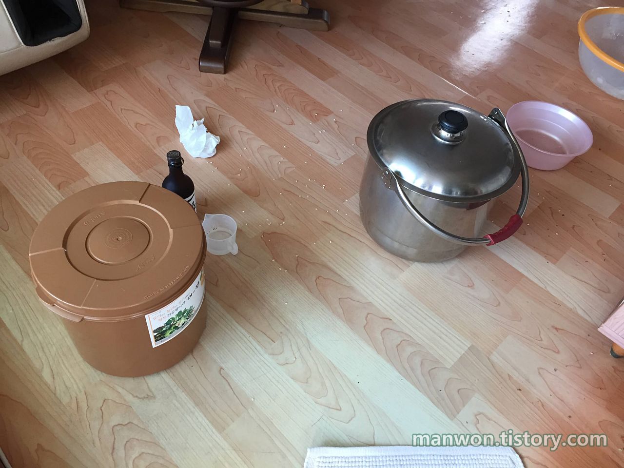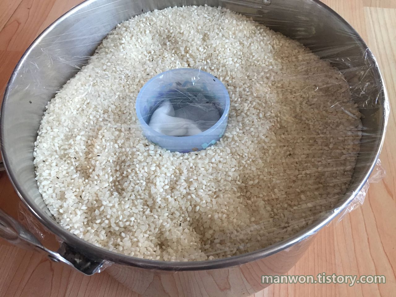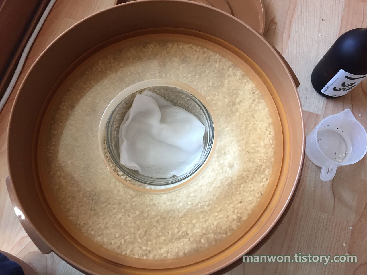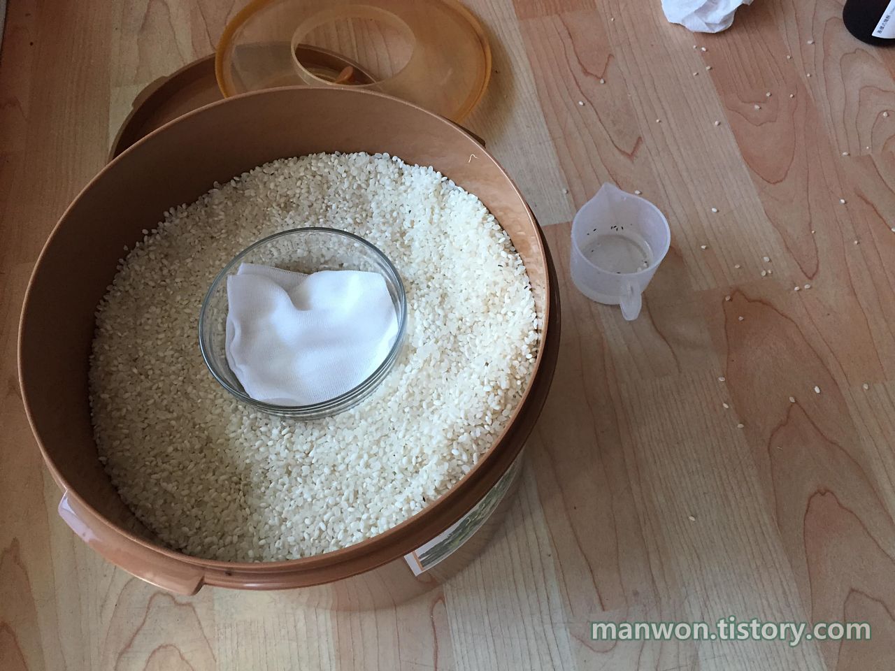 일단 쌀가마니에 있던 쌀의 3분의 2 정도를 스테인리스 쌀통에 옮겨 담고 술이 든 그릇을 넣은 후 뚜껑을 닫았다.