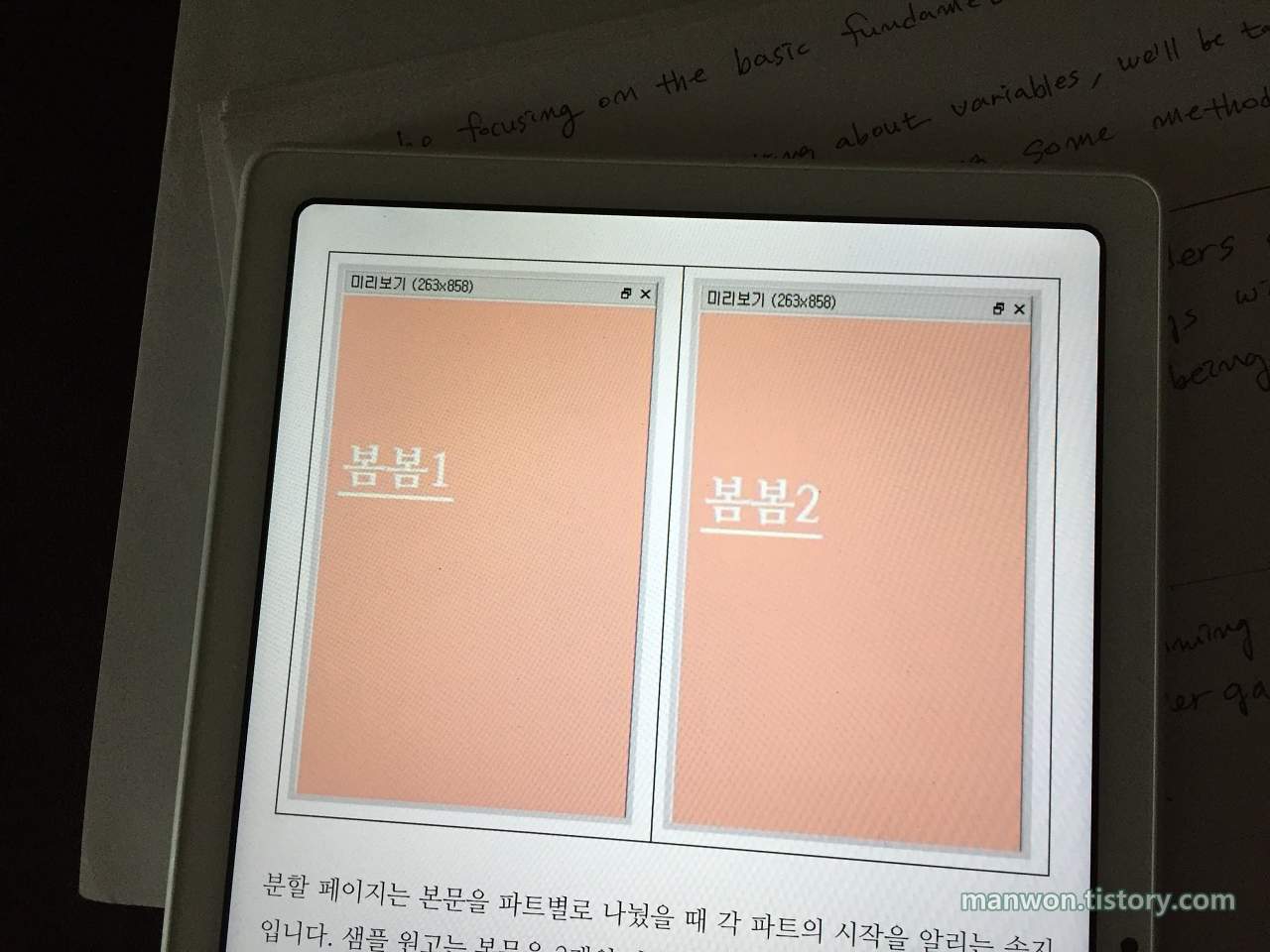 위 사진에서 '봄봄1'이라고 적힌 게 본문 파트 1을 위한 분할 페이지이고 마찬가지로 '봄봄2'라고 적힌 게 본문 파트 2를 위한 분할 페이지다.