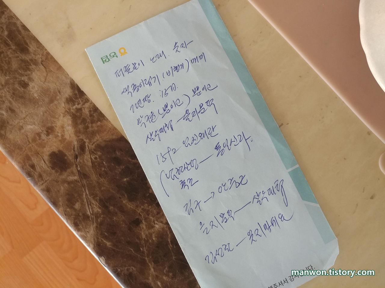오늘은 뭘 배우고 오셨으면 하고 어머니께 물으니 이번에는 아예 이렇게 글로 적어서 내게 건네주셨다.