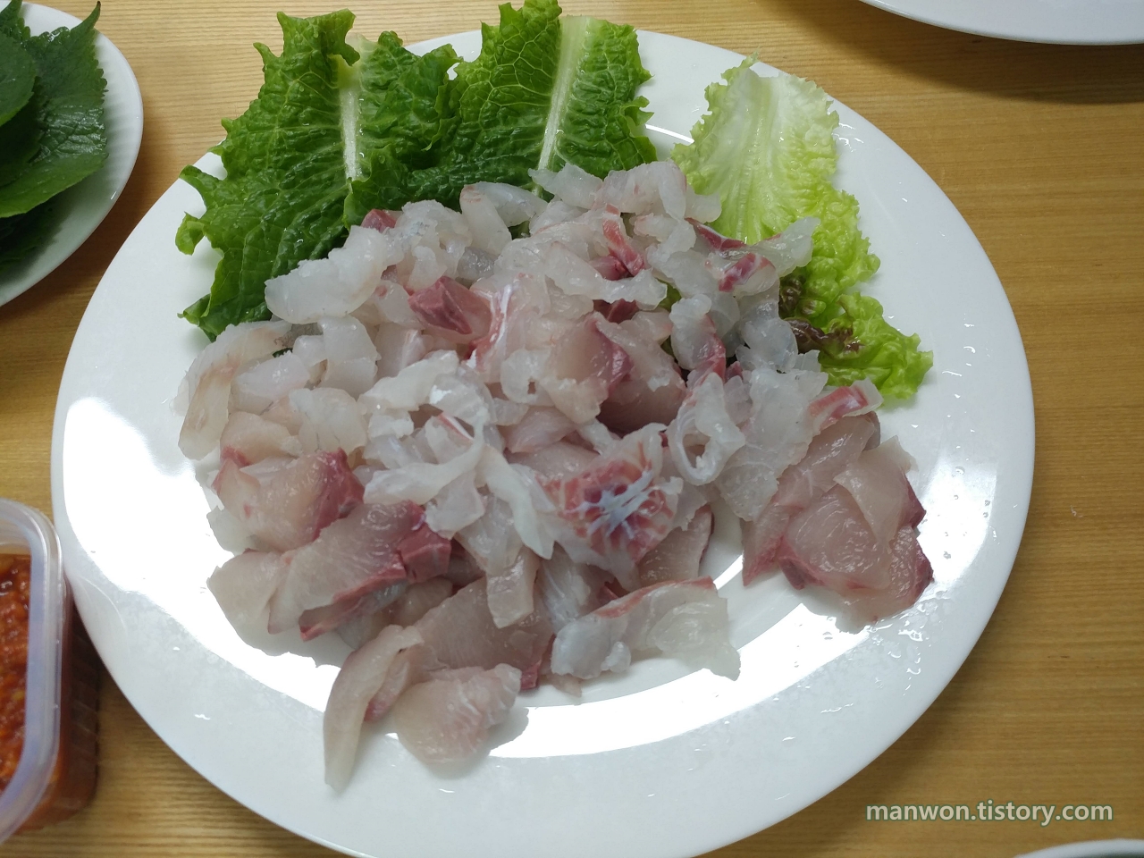 참돔과 방어 그리고 우럭인가 하여튼 그렇게 3마리였는데 우리 식구는 먹는 양이 많치 않아서 3만 원짜리로 회를 떴다. 그러면 위 사진에 보이는 접시 2개 분량이 나온다. 먹는 양이 많다면 5만 원짜리로 뜨면 된다.