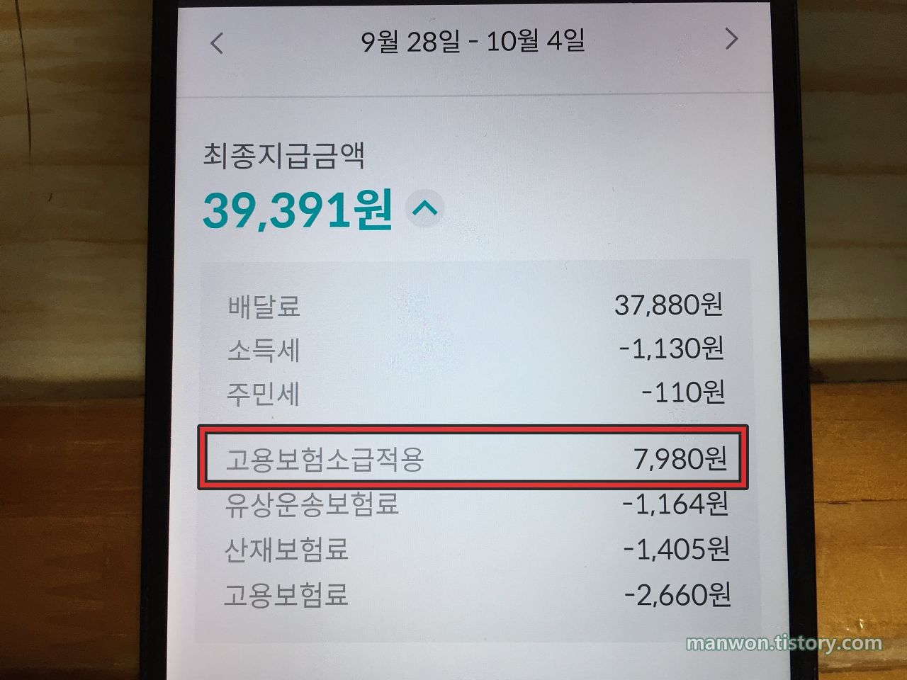 먼저 지난 글에서 매주 2,660원씩 빠지는 고용보험료가 언제 어떻게 환급될지 궁금하다고 했었는데, 이번에 그 궁금증이 해결이 되어서 아래에 해당 내용을 먼저 간단히 기록한 후 9월 28일~10월 4일 기간의 배달 기록을 기술하겠다.