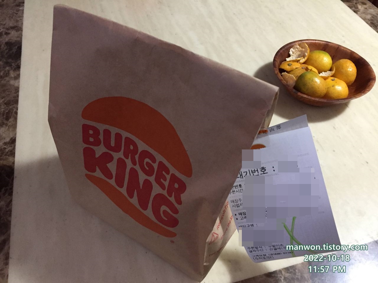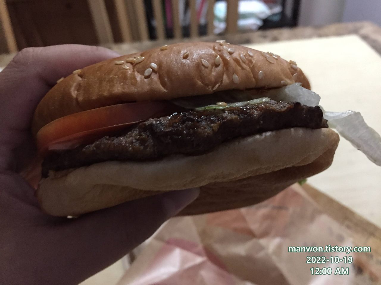 내가 주문하고 내가 버거킹 매장으로 픽업 가서 우리 집으로 들고 온 버거킹 햄버거.