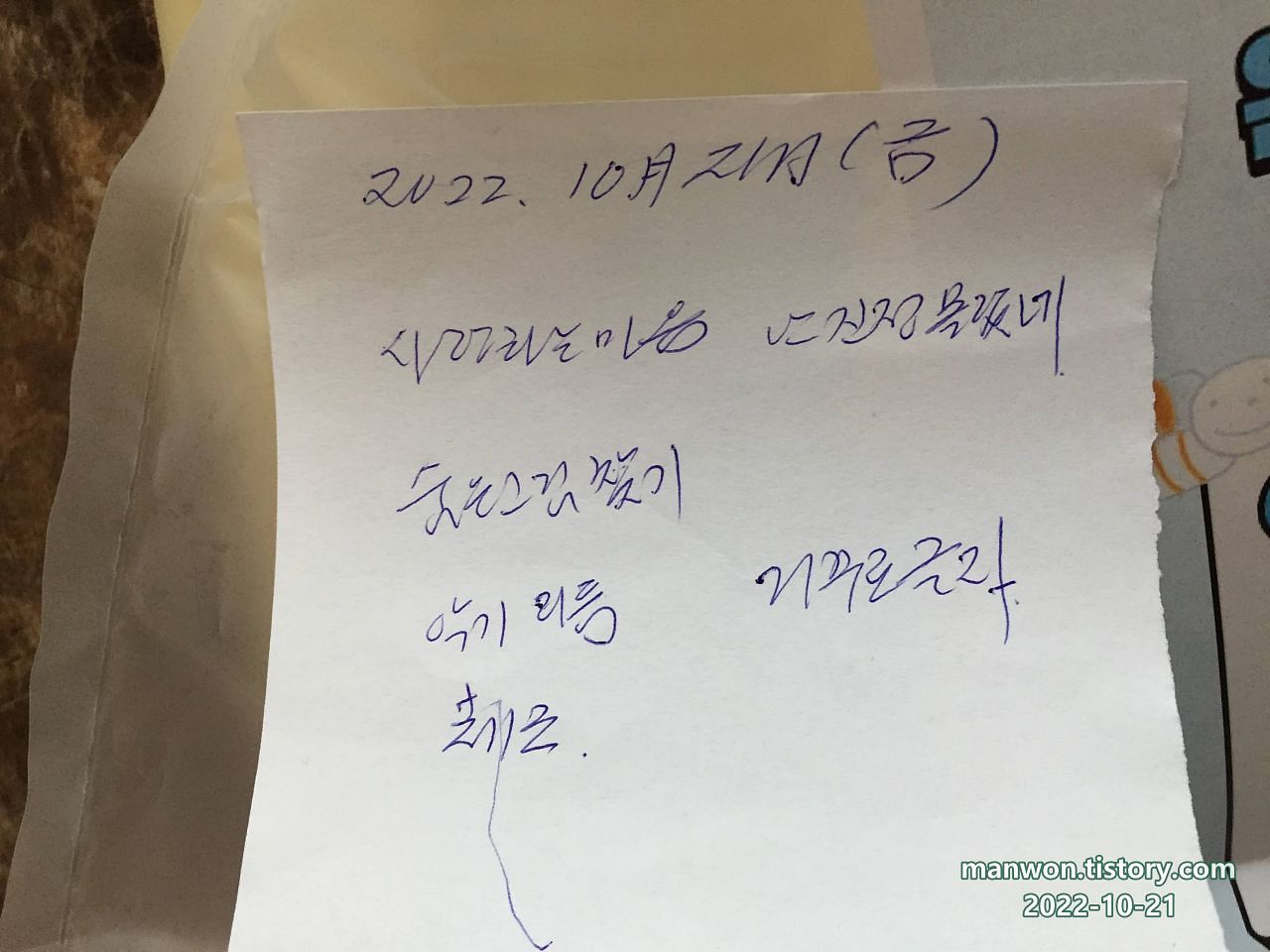 내가 매번 무슨 교육을 받으셨는지 물어서 그런지 교육받은 내용을 메모지에 간단히 기입해 오셨다. 교육 내용은 이전받았던 내용과 비슷비슷하다.