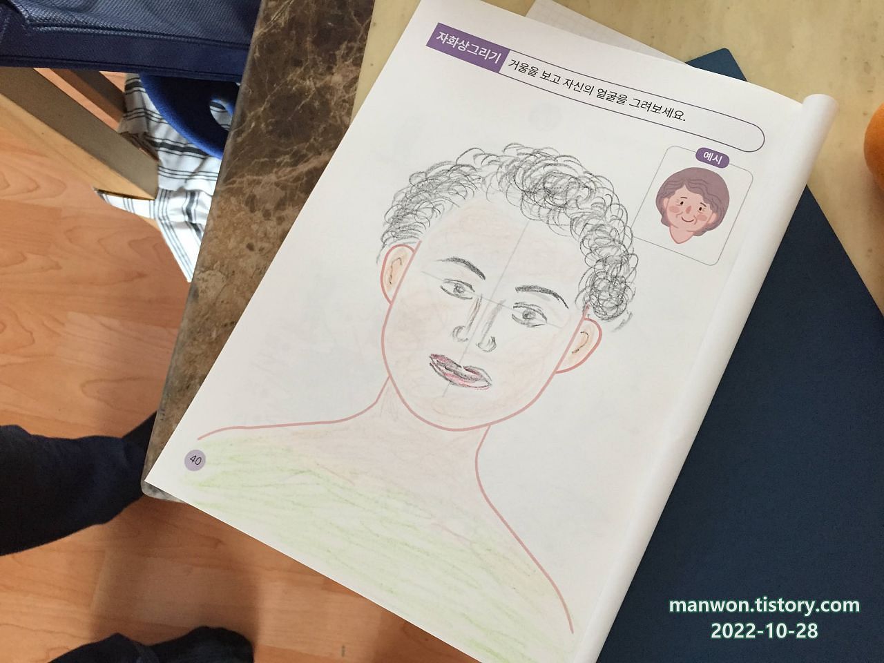 자화상을 그리는 시간도 있었나 보다. 상체와 목 얼굴 라인은 이미 그려져 있고 이목구비와 머리카락만 어머님이 그리신 것 같다. 지금 보니 꽤 잘 그리셨네.