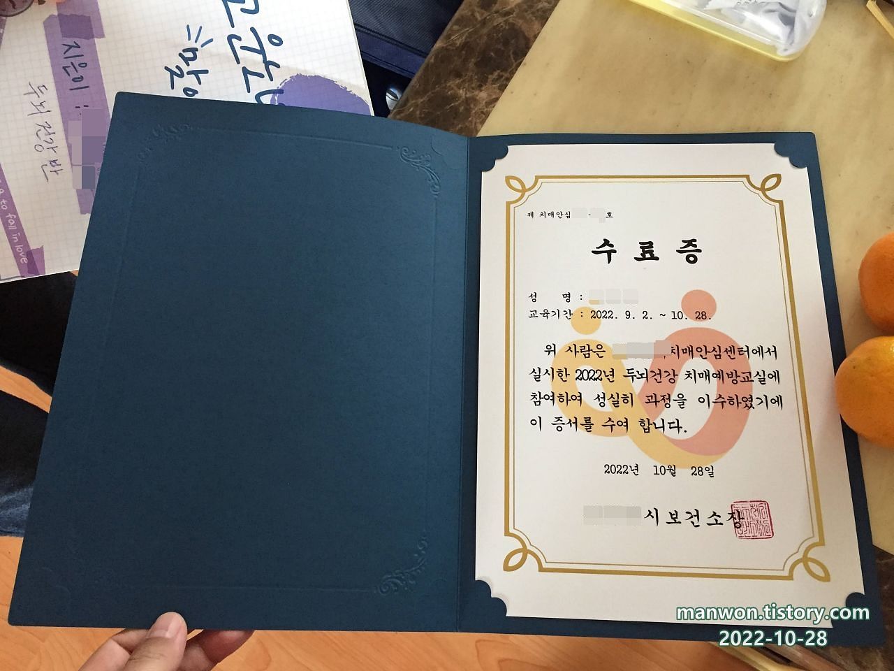 치매안심센터에서 실시한 두뇌건강 치매예방교실 수료증.