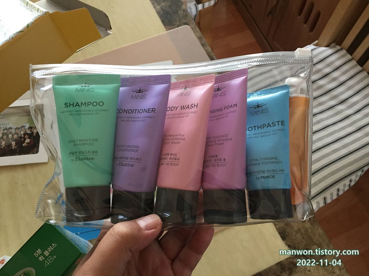 이런 게 들어있다. 어디 여행갈 때 쓰기 좋게 만든 샴푸, 컨디셔너, 바디워시, 클렌징 폼, 치약 세트.