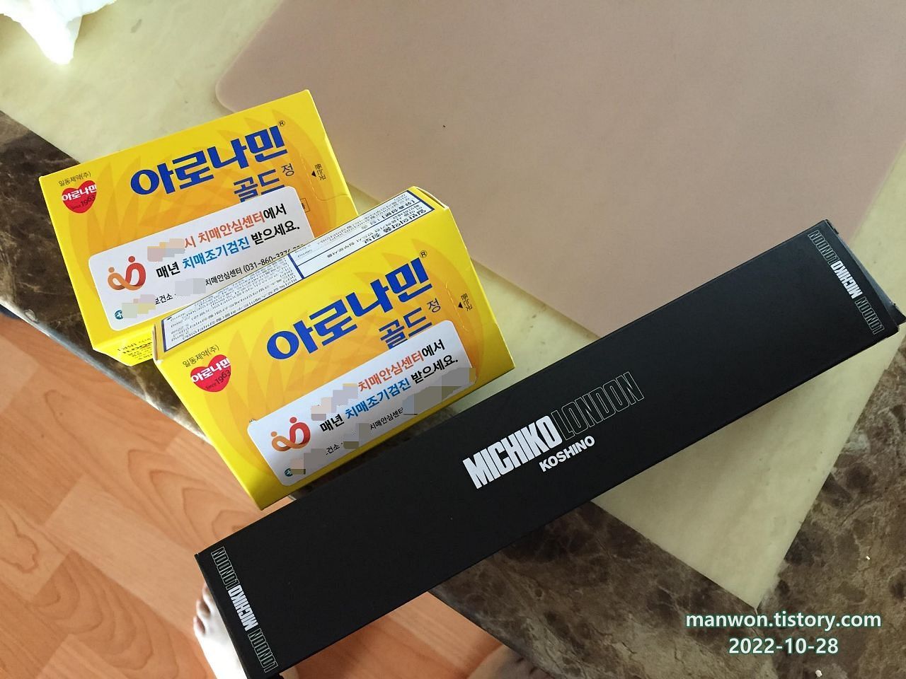 마지막 교육일에 수료식까지 겸했기에 오늘은 증정품이 조금 많았다. 일단 위 사진에 나온 건 아로나민 골드 영양제 2 상자와 미치코런던이라는 상표가 찍힌 양산이다.