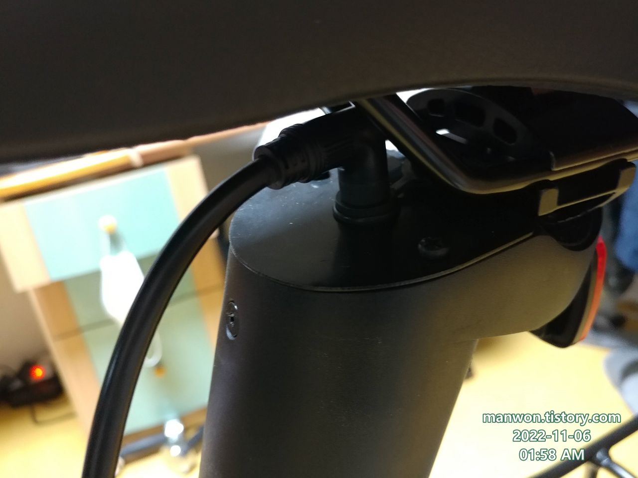 안장 밑에 있는 구멍에 충전 코드를 꼽는다.