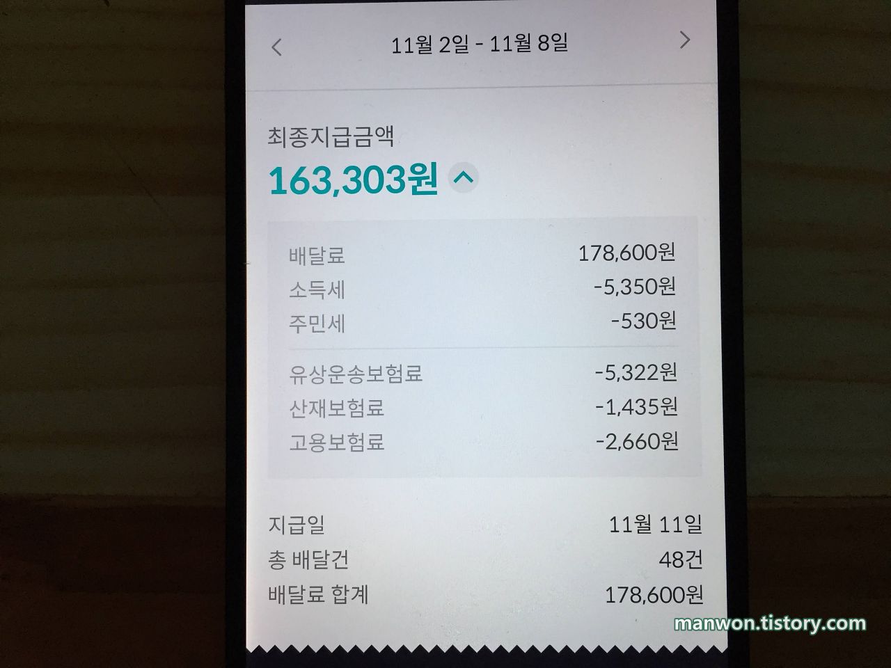 배달료 실수령액: 163,303원
