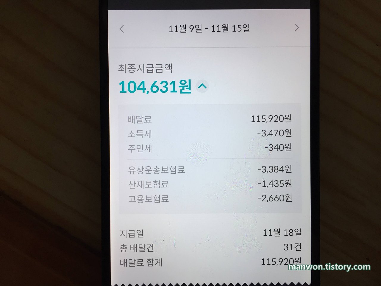 11월 12일 토: 8건 33,740원 (토요일 비가 와서 우비 입고 일반 자전거로 배달)