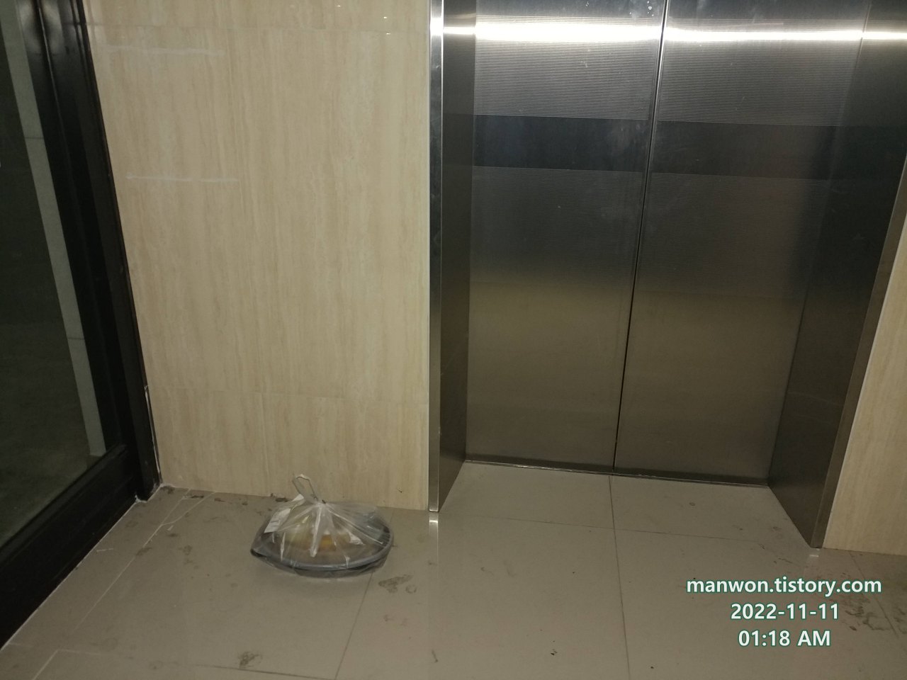 고객은 x층 엘리베이터 옆에 음식을 놓고 가면 된다고 했다. 위 사진처럼 음식을 엘리베이터 옆에 놓은 후 전달 완료 버튼을 눌렀다.