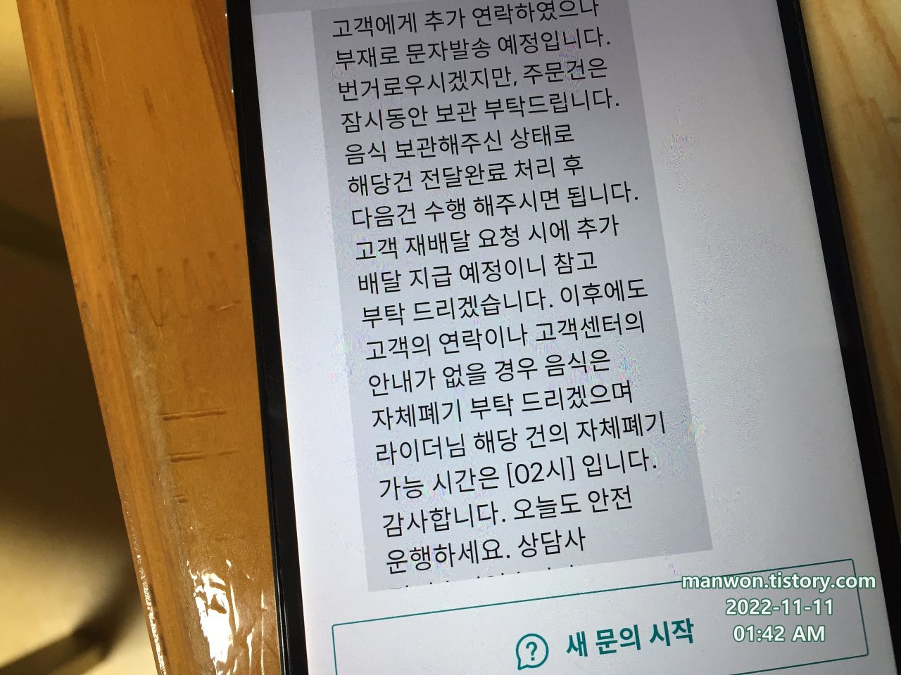 즉 고객 센터에서도 고객과 연락을 시도하고 있으니 대략 1시간 정도 해당 음식물을 내가 보관하고 있으라는 얘기였다. 그때가 새벽 1시였으니까 새벽 2시까지 고객과 연락이 안 되면 그 음식은 자체 폐기하면 된다는 소리였다.