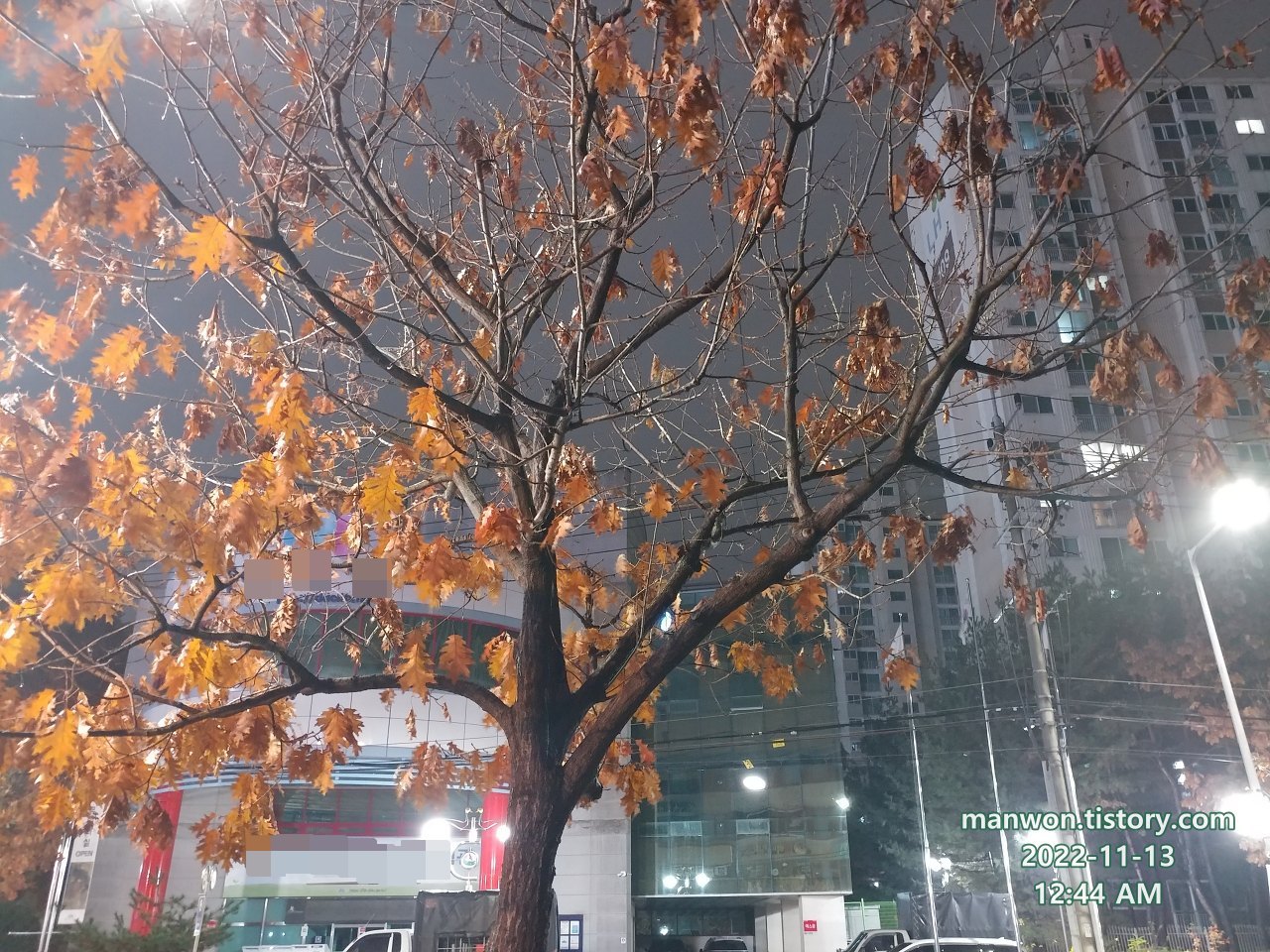 토요일인데 비까지 와서 배달이 많을 줄 알았는데 생각보다 많지는 않았다. 위 사진은 꼬치집 앞에서 음식 나오기를 기다리다가 찍은 낙엽 사진. 벌써 새벽 자정이 넘은 시점이다.