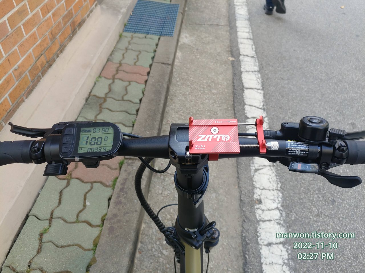 핸들바 거의 중앙에 ztto라고 적힌 게 핸드폰 거치대다. 이번에 퀄리 큐맥스 롱레인지를 구매할 때 사은품으로 부착해서 온 거치대이다. 보통 배달 대행하는 사람들이 쓰는 건 거치대에 핸드폰을 착 놓으면 착 붙는 그런 건데 이건 아쉽게도 그런 방식은 아니다.