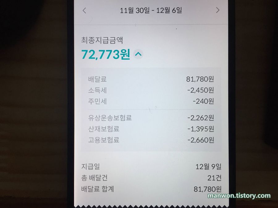 이번 포스팅에서는 11월 30일 수요일부터 12월 6일 화요일까지 일주일간 자전거로 배달한 내역을 정리했다. 오늘 포스팅에 기록한 내용은 아래와 같다.