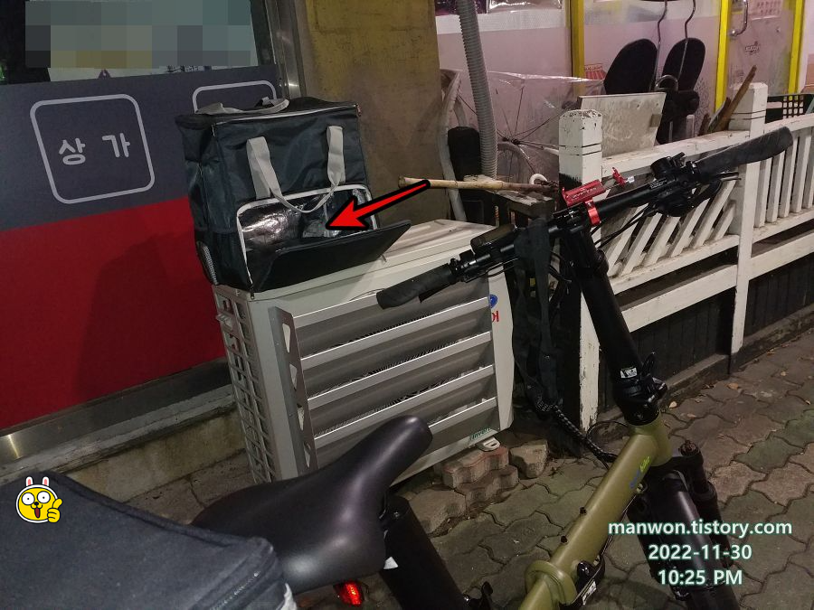 그렇기 때문에 위 사진처럼 에어컨 실외기 등에 가방을 미리 올려놓거나 그것도 없다면 자전거 뒷짐받이 등에 요령껏 가방을 얹는 방법이 있는데 그것 역시 아주 편한 방법은 아니다.