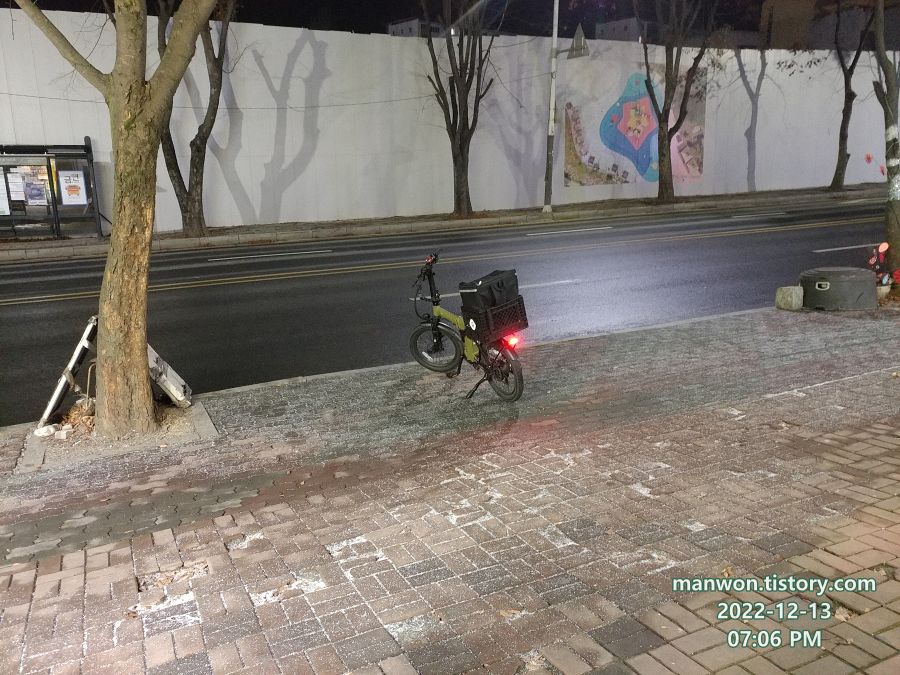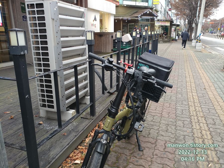 12월 10일 토요일 저녁 피크 시간대였다. 외곽에 위치한 아파트에 통닭 배달을 마치고 서둘러 시내 중심지로 이동하기 위해 자전거에 올라타려는 순간이었다. 내 다리가 살짝 빅앤트 폴딩박스를 툭 치는 일이 발생했다.