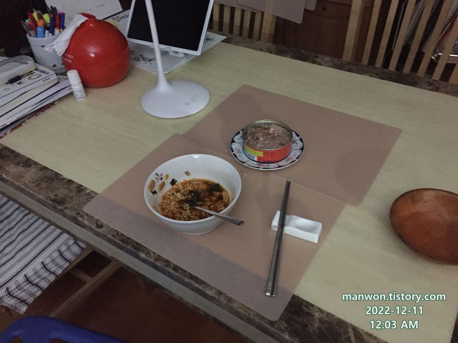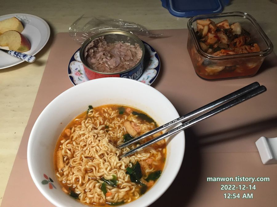 먹다 남은 라면을 참치와 함께 먹었다. 식은 라면도 밥 말아먹으니 꽤 맛있네.
