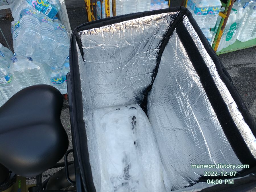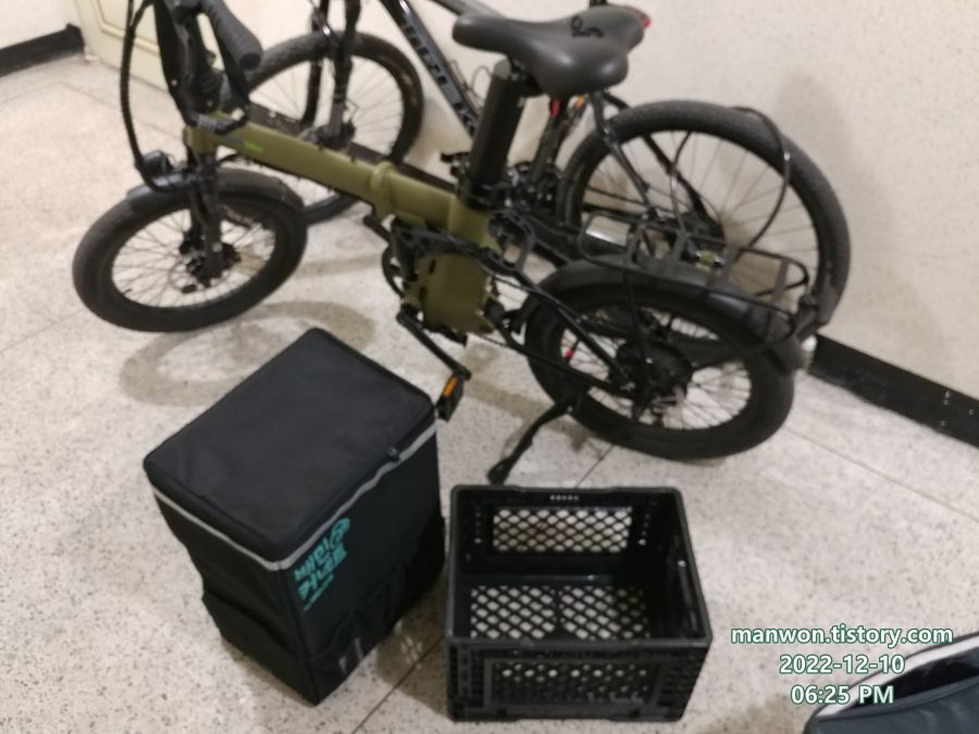 뒷짐받이는 위 사진처럼 빅앤트 폴딩박스와 구형 배민 가방을 조합해서 쓰고 있다. 등에 메면 부담스러운 짐도 저 뒷짐받이 가방에 넣으면 참으로 좋다. 어쩔 때는 주행하다가 "어? 내가 뒤에다 짐을 실었나?" 하는 생각이 들 정도다.