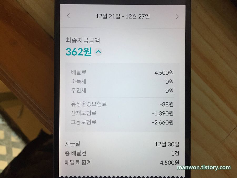 그렇다! 사실이었다. 배달을 1건 하든 100건 하든 산재보험료 1,390원과 고용보험료 2,660원은 일주일 단위로 1번씩 동일하게 빠지기 때문이다. 이럴 거면 정산 마지막 날인 12월 27일에 배달하지 않고 그다음 날 배달하는 게 훨씬 더 현명한 선택이란 거다. 쉽게 말해 쉬는 주는 아예 1건도 하지 않고 쉬는 게 낫다는 소리. 괜히 본인처럼 1주에 1건 정도 깔짝 대면 보험료만 한 번 더 빠지는 셈이란 거다.