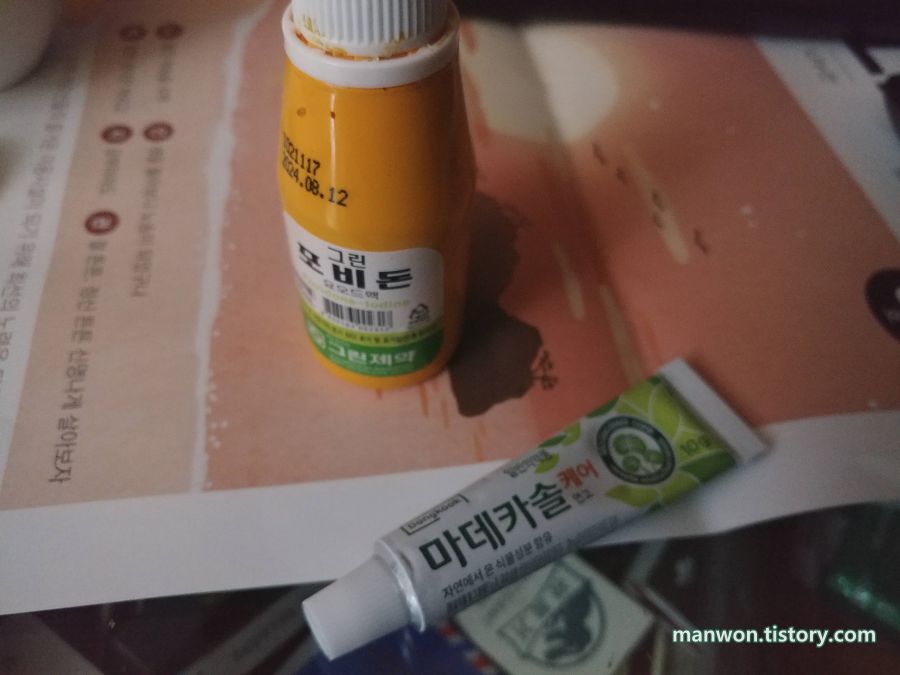 일단 빨간약으로 소독을 했다. 그리고 너덜너덜해진 살점에 마데카솔 연고를 발랐다. 살점이 마치 컵라면 뚜껑처럼 열렸다 닫혔다 한다.